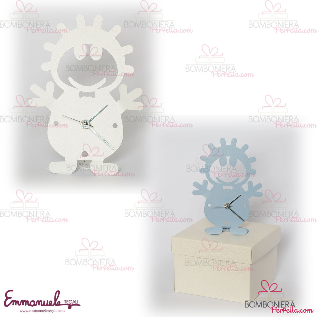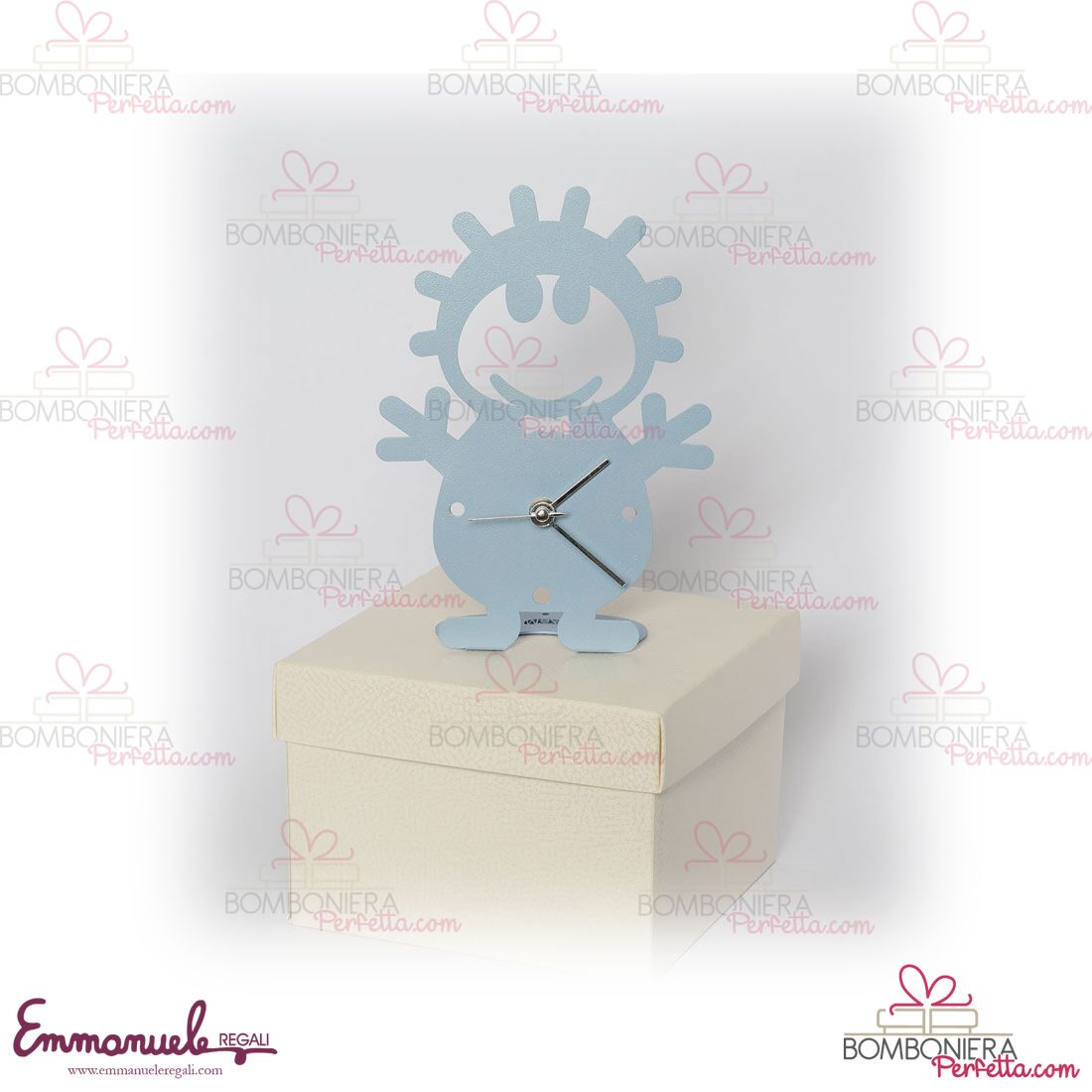 La Linea "Orologio Bibo", collezione Arti e Mestieri 2022, è una linea di eleganti orologi da tavolo stilizzati con bimbo elegante in color celeste e bianco.