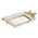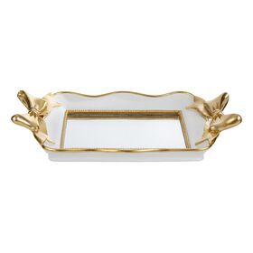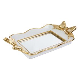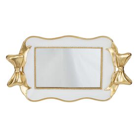 Il vassoio in resina Fiocco Gold misura 31x17x5,5 cm ed è caratterizzato da una finitura bianca con dettagli dorati e decori a fiocco sugli angoli.