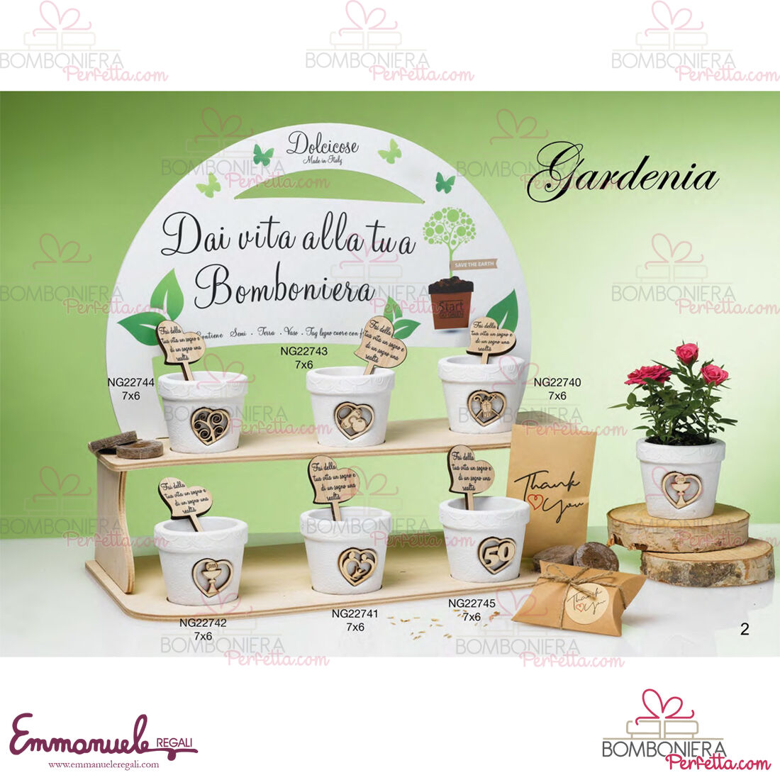 La linea Gardenia di Dolcicose è una collezione di bomboniere green "Save the Earth". Ogni bomboniera è composta da un vasetto realizzato in polvere di marmo con applicazione in legno, una scatolina contenente semi e terra e un tag in legno a forma di cuore con aforisma "Fai della tua vita un sogno e di un sogno una realtà"