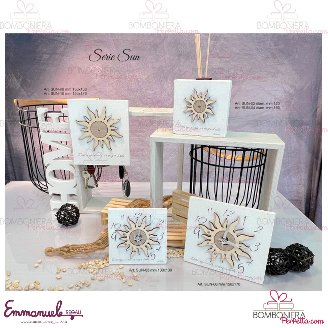 L'orologio piccolo Sole in legno fa parte della linea "Sun" con degli originali orologi,profumatori e appendichiavi con decoro sole in legno davvero originale. ll giorno in cui festeggiamo un’occasione speciale è un giorno che vogliamo ricordare per sempre.