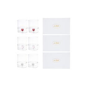Il set comprende due bicchieri in vetro trasparente con un dettaglio a forma di cuore colorato integrato nella base, proposti in tre diverse varianti cromatiche.