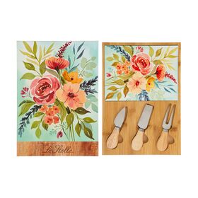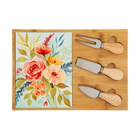 Questo set da quattro pezzi comprende un tagliere in legno decorato con motivi floreali vivaci e tre posate per formaggio con manici ergonomici in legno.