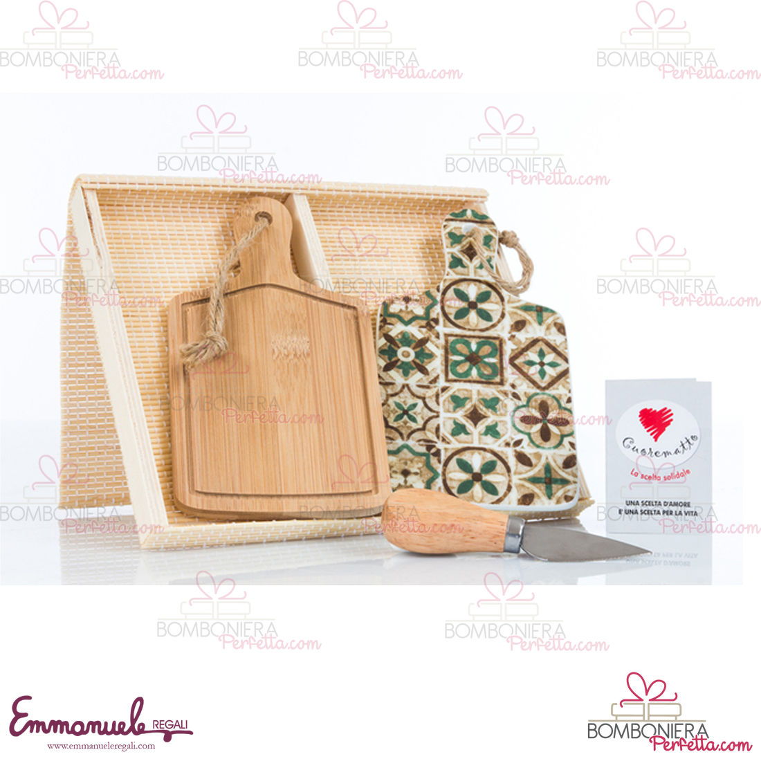 Bomboniera solidale " Set due taglieri legno e ceramica con coltellino " collezione Cuordamalfi di Cuorematto, set di due taglieri uno in legno e uno in ceramica finemente decorata, coltellino taglia grana incluso. Completo di scatola regalo in bambù.