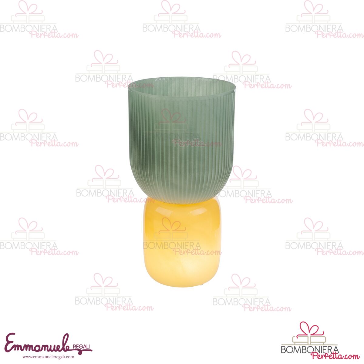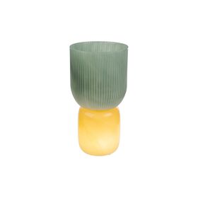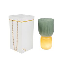 Il vaso in vetro Lampada Verde d.12xh.23 cm si distingue per un design moderno, caratterizzato da una base opaca sui toni giallo ambra e una parte superiore verde con lavorazione a coste verticali.