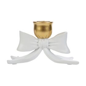 Questo portacandele in resina presenta una raffinata forma a fiocco con finitura oro nella parte superiore, dettagliando un design elegante e moderno.