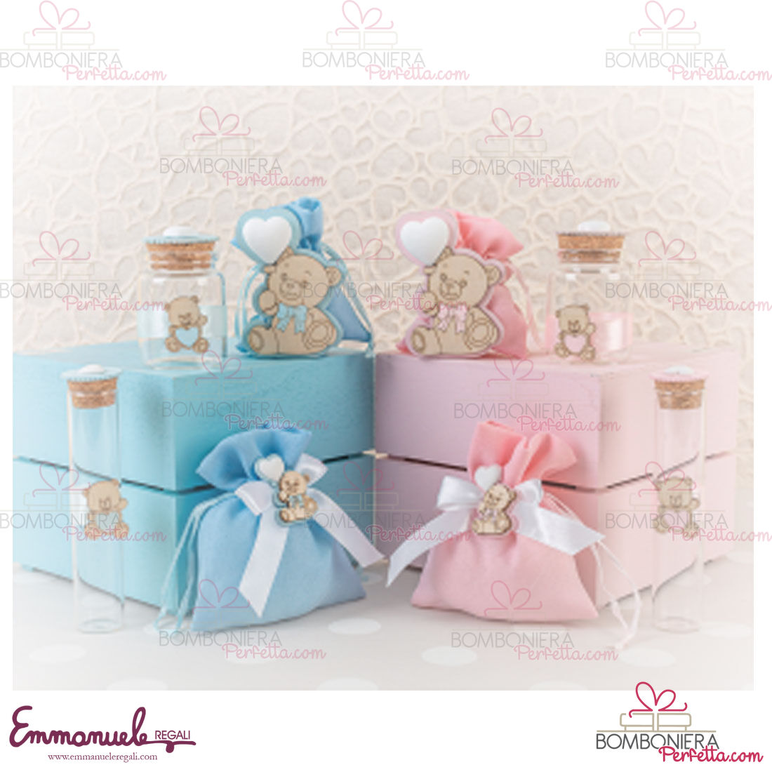 La Linea "Nascita", collezione Le Stelle, è una linea di sacchettini,portasacchetti,barattolini e provette portaconfetti con decori celeste e rosa adatti per la vostra occasione.