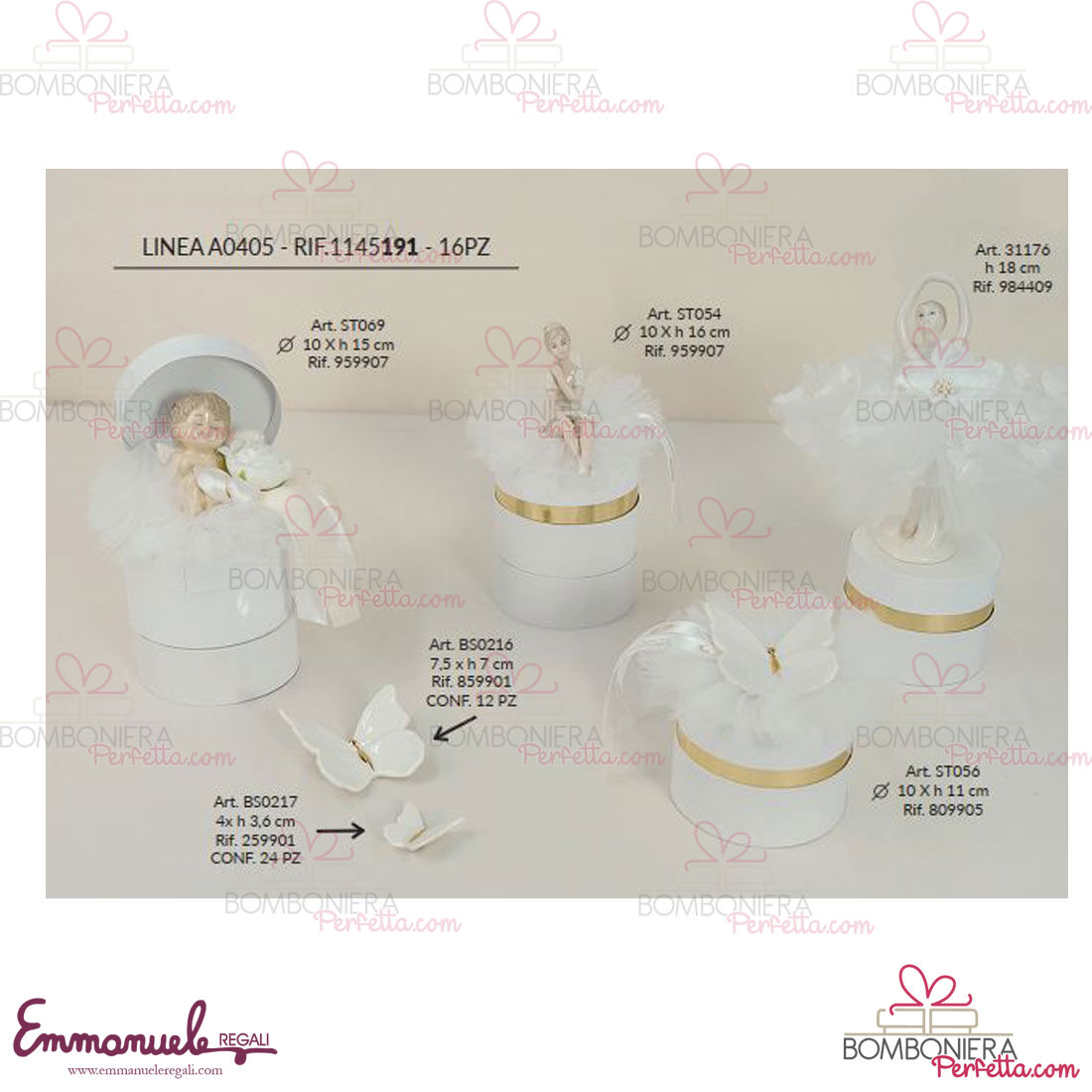La linea A0405 de L'Infinito1972 è una collezione davvero delicata nei suoi colori neutro con Angeli,Farfalle e Ballerine, idee davvero eleganti per ricordare i vostri eventi. L' azienda leader da 45 anni nella creazione di prodotti per occasioni speciali, propone un vasto assortimento di articoli studiati seguendo le nuove tendenze, ma mai dimenticando il gusto tutto italiano per il classico e la tradizione.