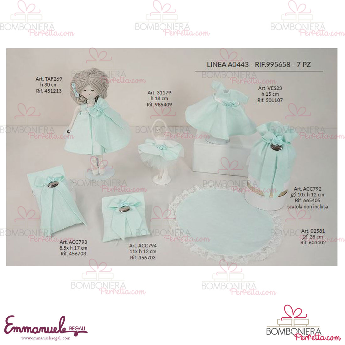 La linea A0443 de L'Infinito1972 è una collezione davvero delicata nei suoi colori verde pastyello con Ballerine e bambonile, sacchetti e portaconfetti con idee davvero eleganti per ricordare i vostri eventi. L' azienda leader da 45 anni nella creazione di prodotti per occasioni speciali, propone un vasto assortimento di articoli studiati seguendo le nuove tendenze, ma mai dimenticando il gusto tutto italiano per il classico e la tradizione. I prodotti di competenza dell'azienda comprendono bomboniere ed accessori relativi ad essa, bambole e folletti da collezione, ballerine in porcellana, vetri artistici e cristalli, corredo arredo, arredo funzionale, profumatori e saponeria, statuine in porcellana, ceramiche artistiche, articoli di limoges, legno, resina artistica, sheffield ed argento, album fotografici, vangeli e fiocchi nascita, creati per condividere e ricordare i momenti più preziosi ed indimenticabili della nostra vita. Ogni prodotto a marchio L'Infinito viene esaltato da una certosina lavorazione artigiana ed impreziosito da materiali di prim'ordine, tra i quali spiccano le pregiate stoffe e la rinomata porcellana di Capodimonte , tipiche della località nella quale il marchio è andato evolvendosi.