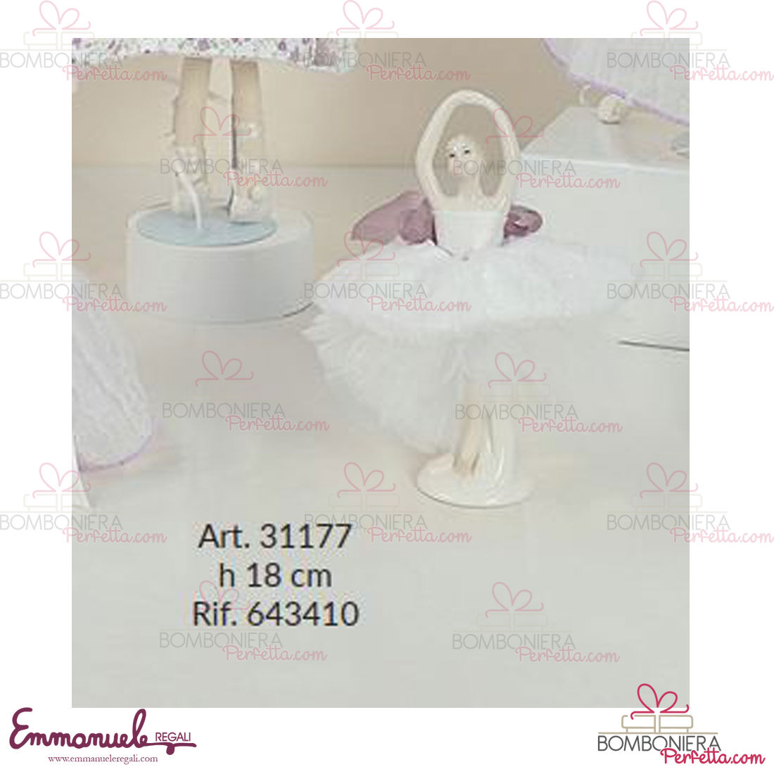 La linea A0445 de L'Infinito1972 è una collezione davvero delicata nei suoi colori delicati e neutri con Ballerine e bambole con idee davvero eleganti per ricordare i vostri eventi. L' azienda leader da 45 anni nella creazione di prodotti per occasioni speciali, propone un vasto assortimento di articoli studiati seguendo le nuove tendenze, ma mai dimenticando il gusto tutto italiano per il classico e la tradizione. I prodotti di competenza dell'azienda comprendono bomboniere ed accessori relativi ad essa, bambole e folletti da collezione, ballerine in porcellana, vetri artistici e cristalli, corredo arredo, arredo funzionale, profumatori e saponeria, statuine in porcellana, ceramiche artistiche, articoli di limoges, legno, resina artistica, sheffield ed argento, album fotografici, vangeli e fiocchi nascita, creati per condividere e ricordare i momenti più preziosi ed indimenticabili della nostra vita. Ogni prodotto a marchio L'Infinito viene esaltato da una certosina lavorazione artigiana ed impreziosito da materiali di prim'ordine, tra i quali spiccano le pregiate stoffe e la rinomata porcellana di Capodimonte , tipiche della località nella quale il marchio è andato evolvendosi.
