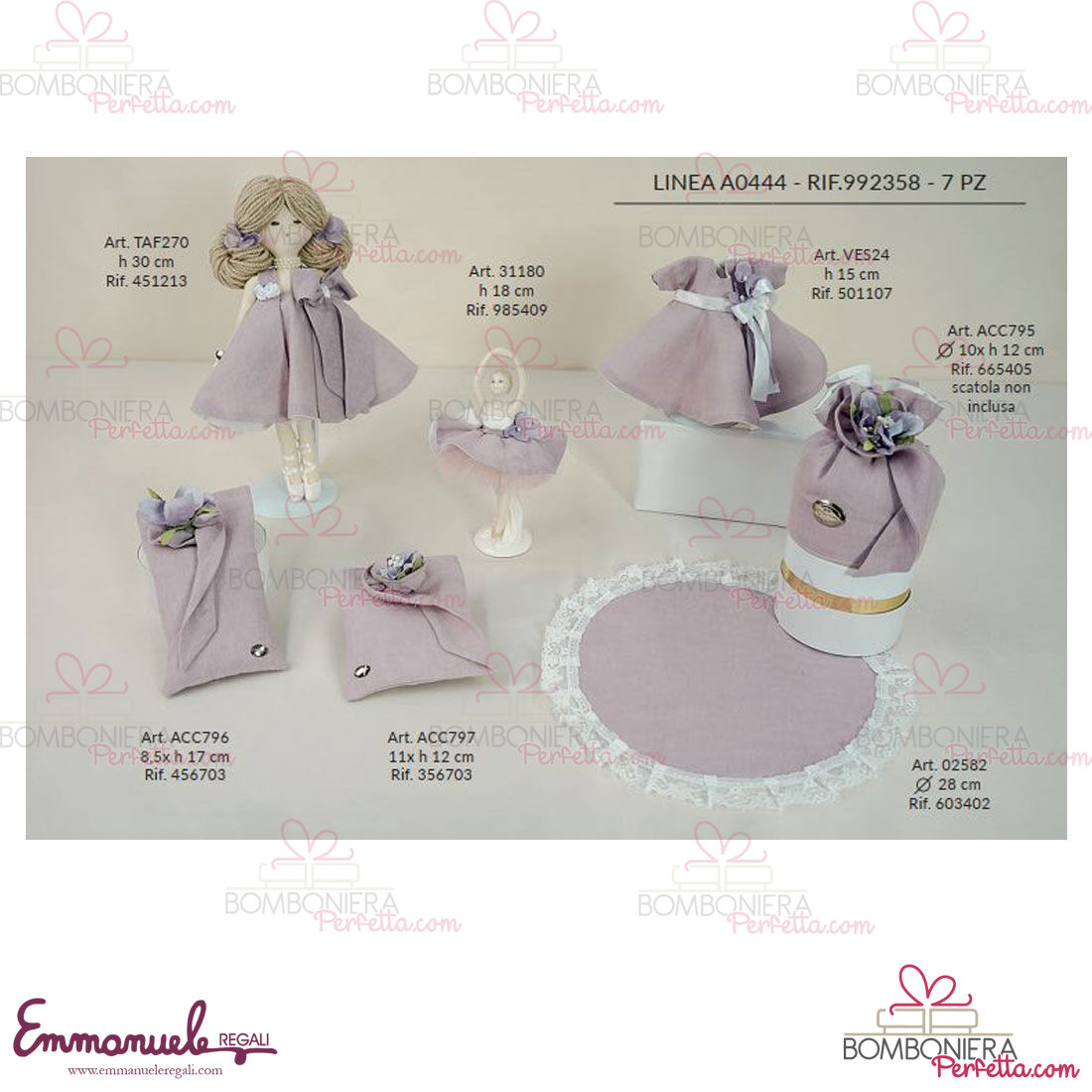 La linea A0444 de L'Infinito1972 è una collezione davvero delicata nei suoi colori delicati e neutri con Ballerine e bambole, sacchetti e portaconfetti con idee davvero eleganti per ricordare i vostri eventi. L' azienda leader da 45 anni nella creazione di prodotti per occasioni speciali, propone un vasto assortimento di articoli studiati seguendo le nuove tendenze, ma mai dimenticando il gusto tutto italiano per il classico e la tradizione. I prodotti di competenza dell'azienda comprendono bomboniere ed accessori relativi ad essa, bambole e folletti da collezione, ballerine in porcellana, vetri artistici e cristalli, corredo arredo, arredo funzionale, profumatori e saponeria, statuine in porcellana, ceramiche artistiche, articoli di limoges, legno, resina artistica, sheffield ed argento, album fotografici, vangeli e fiocchi nascita, creati per condividere e ricordare i momenti più preziosi ed indimenticabili della nostra vita. Ogni prodotto a marchio L'Infinito viene esaltato da una certosina lavorazione artigiana ed impreziosito da materiali di prim'ordine, tra i quali spiccano le pregiate stoffe e la rinomata porcellana di Capodimonte , tipiche della località nella quale il marchio è andato evolvendosi.