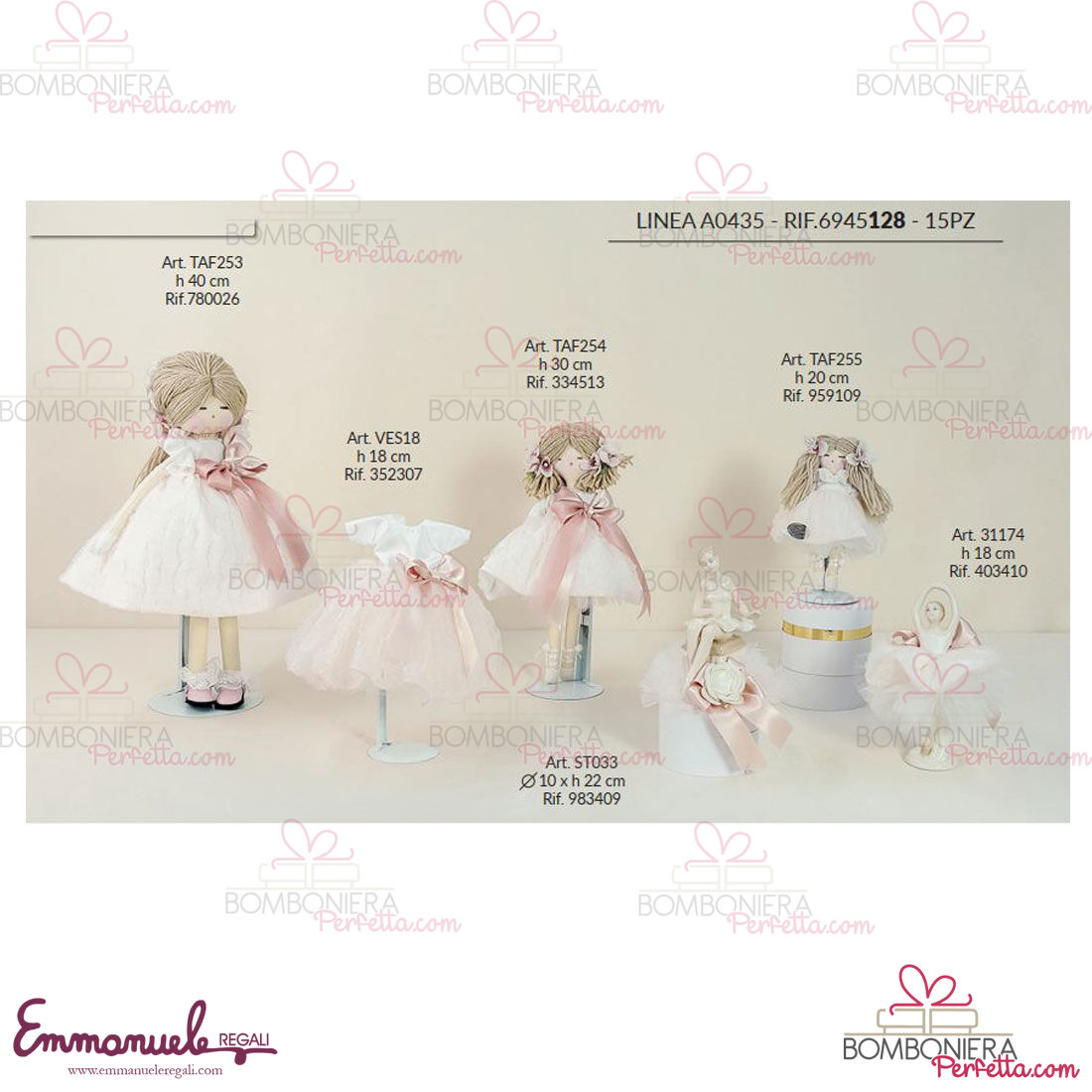 La linea A0435 de L'Infinito1972 è una collezione davvero originale con dolcissime bamboline e ballerine con fiocchi e tullè delicati adatte per i vostri eventi.