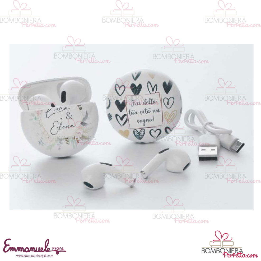 La linea Music di Dolcicose è una collezione davvero unica e moderna con delle originali Cuffie bluetooth. Oggetto usato a tutte le età, di prima qualità con stampe per ogni cerimonia riportando delle belle frasi. Le cuffiette wi fi hanno la loro scatola con la sede per l'oggetto e per i confetti e con cavetto usb sul fondo della scatola.