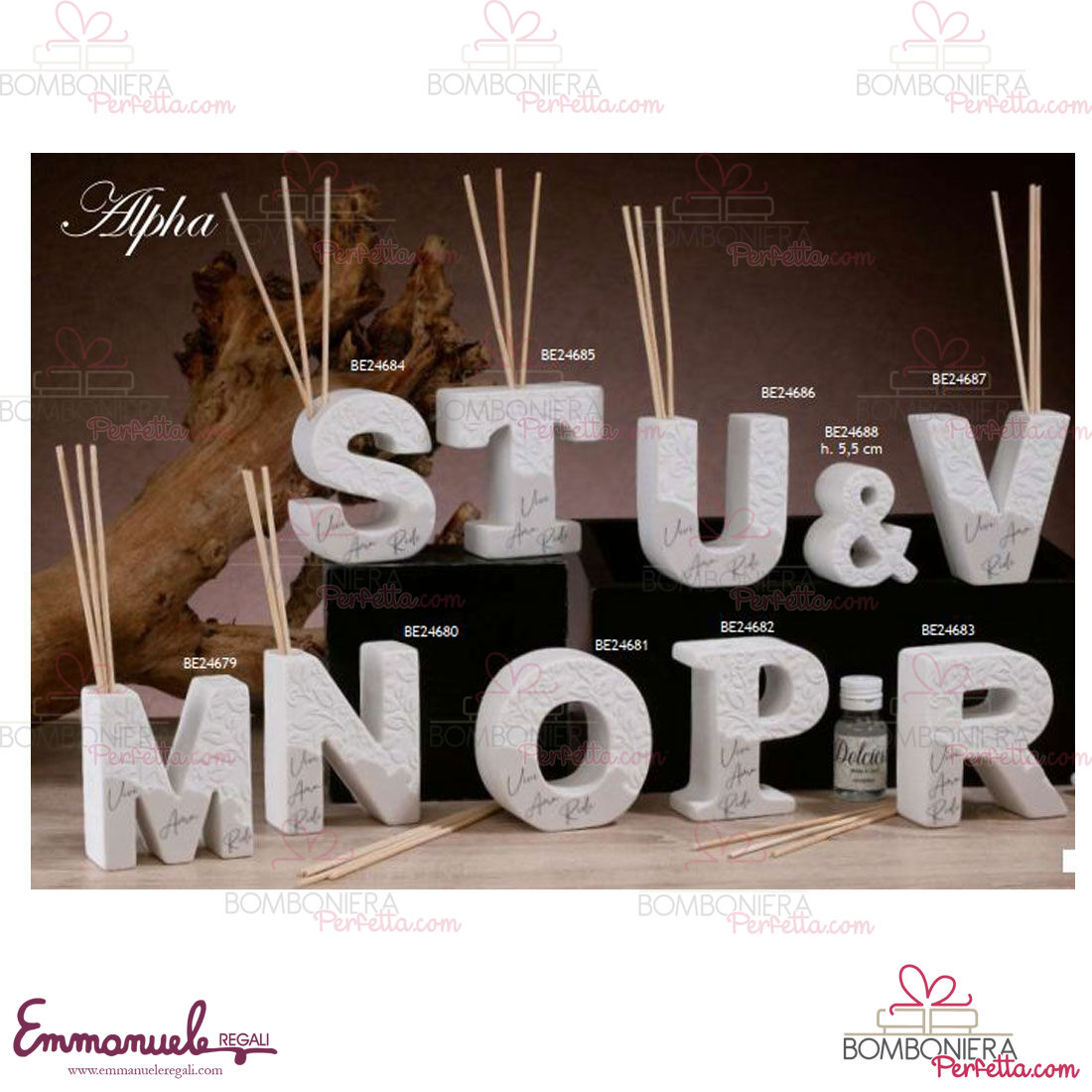 La linea Alpha di Dolcicose è una collezione davvero originale con dei bellissimi diffusori con le lettere dell'alfabeto in polvere di marmo e decoro con frase davvero molto particolari per i vostri vari eventi.