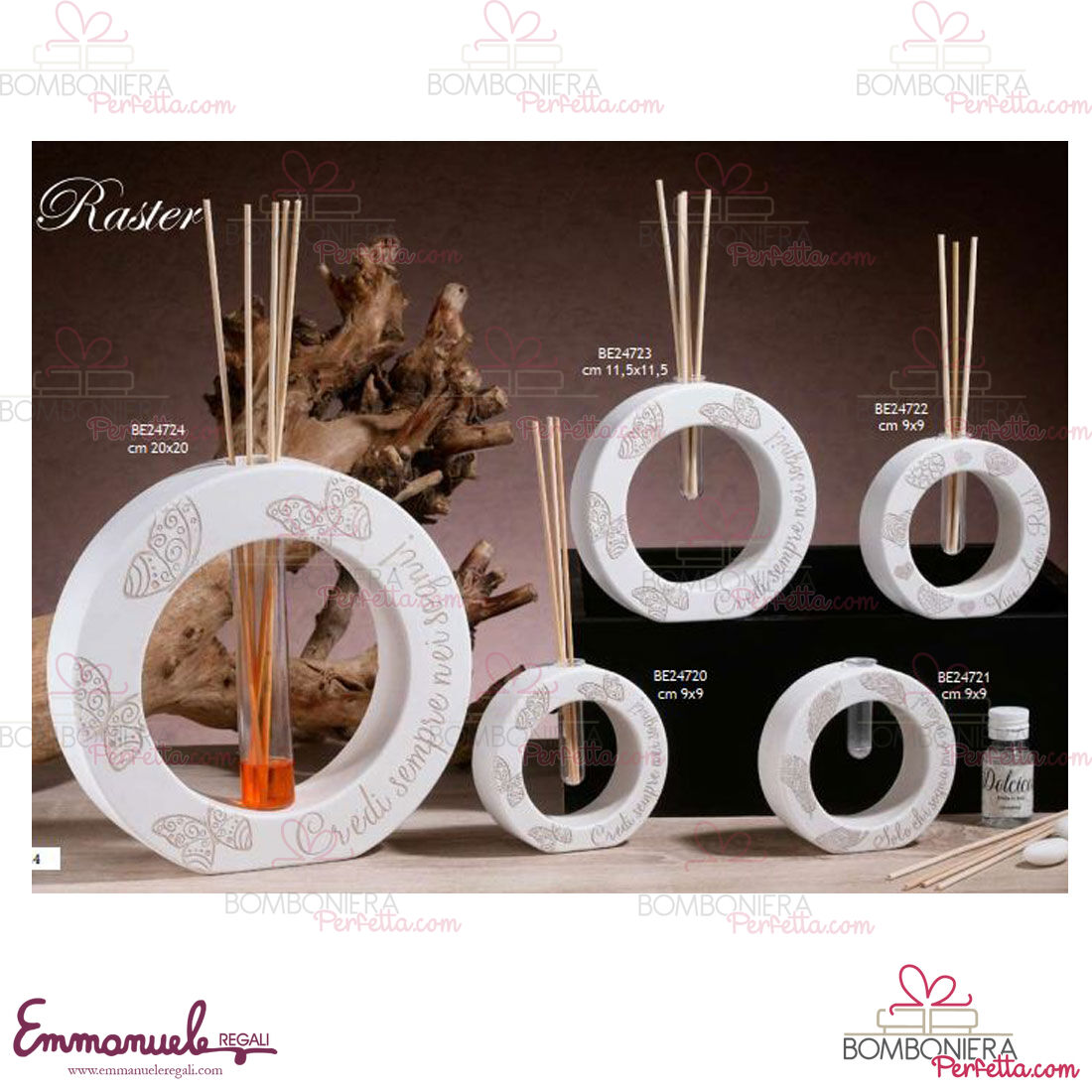 La linea Raster di Dolcicose è una collezione davvero originale con dei bellissimi diffusori,portafoto e orologi decorati con farfalle e con frase davvero molto particolari per i vostri vari eventi.