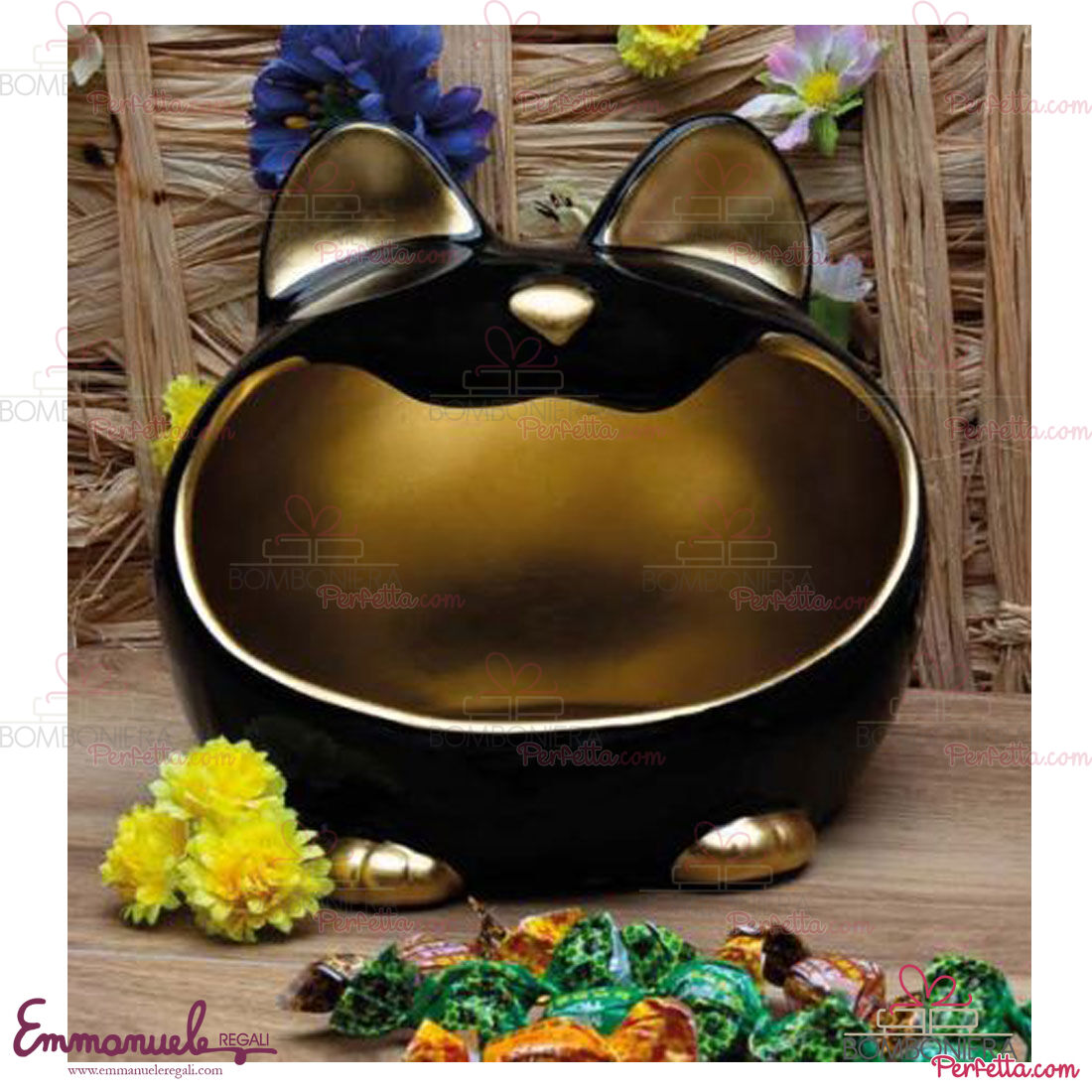 Il gattomatto portatutto con astuccio colore nero interno oro, sono incluse caramelle al miele (50gr), della collezione Cuorematto, è un'idea di bomboniera e articolo decorativo, perfetto per rendere i vostri eventi unici.
