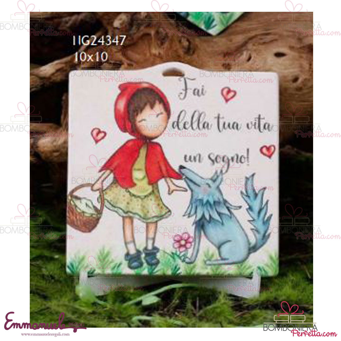 La linea Favola "Cappuccetto Rosso" di Dolcicose è una collezione davvero originale con lampade, diffusori,salvadanai, orologi,portaconfetti,mattonella, matite piantabili,portachiavi e bijoux con interno personalizzato decorato con Cappuccetto Rosso. La linea è realizzata in polvere di marmo di Carrara extrabianco e le stampe sono realizzate con tecnologie UV con risoluzione eccezionale con rilievo al tatto molto resistente alla luce.