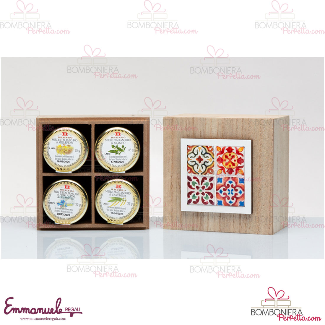 La scatola degustazione 4 mieli della collezione Sicilia Cuorematto, è un'idea di bomboniera e articolo decorativo, perfetto per rendere i vostri eventi unici.