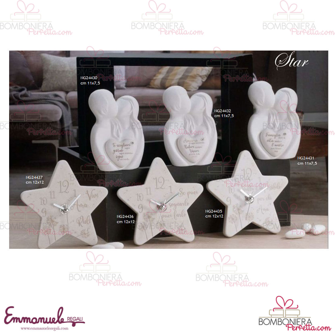 La linea Star di Dolcicose è una collezione davvero originale con Sposi, orologi e diffusori. La linea è realizzata con effetto pietra partendo sempre dal marmo di Carrara extrabianco ed è stata applicata manualmente una patinatura ottenuta con terre naturali.