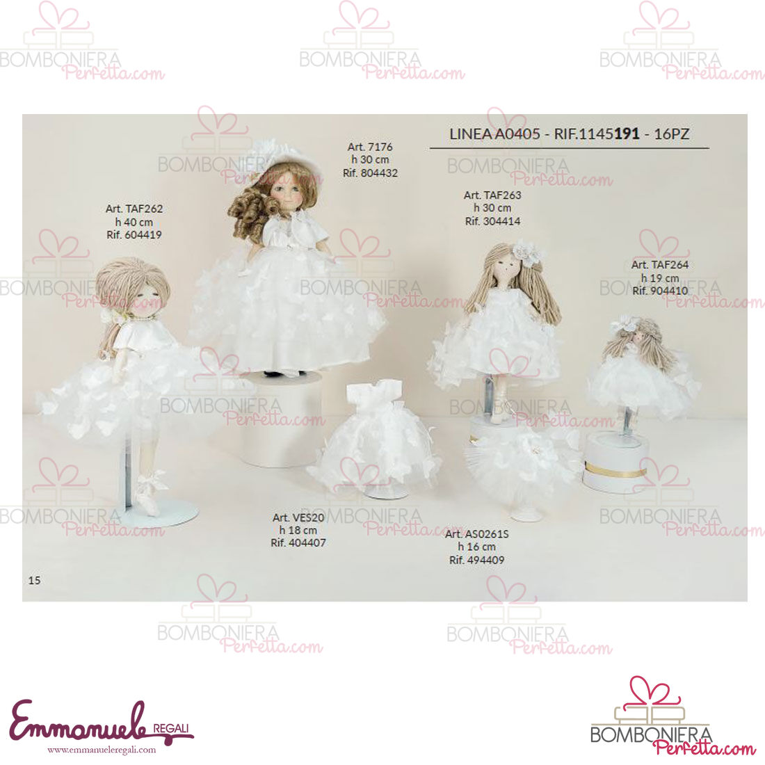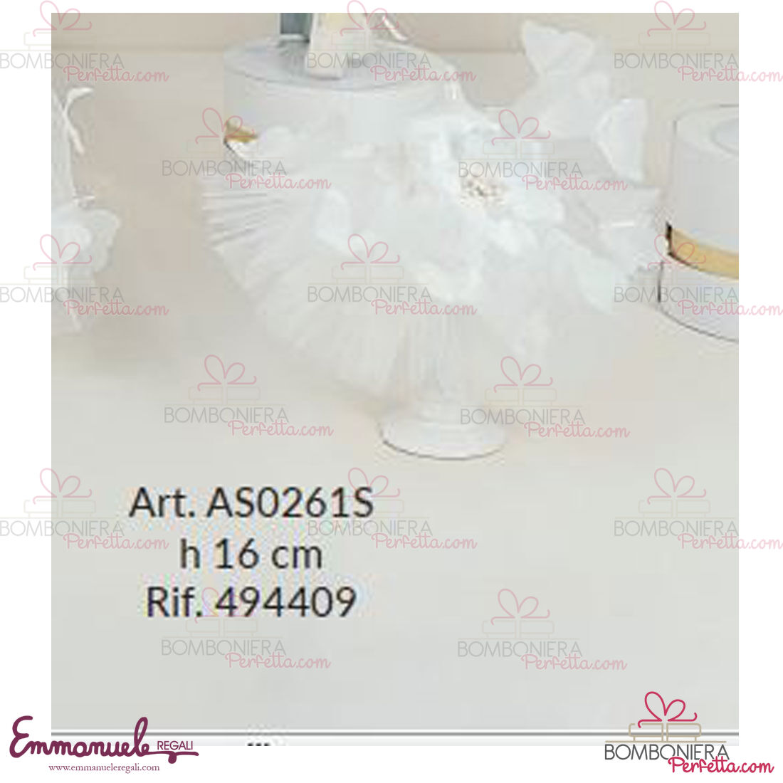 La linea A0405 de L'Infinito1972 è una collezione davvero delicata nei suoi colori neutro con Angeli,Farfalle e Ballerine, idee davvero eleganti per ricordare i vostri eventi. L' azienda leader da 45 anni nella creazione di prodotti per occasioni speciali, propone un vasto assortimento di articoli studiati seguendo le nuove tendenze, ma mai dimenticando il gusto tutto italiano per il classico e la tradizione. I prodotti di competenza dell'azienda comprendono bomboniere ed accessori relativi ad essa, bambole e folletti da collezione, ballerine in porcellana, vetri artistici e cristalli, corredo arredo, arredo funzionale, profumatori e saponeria, statuine in porcellana, ceramiche artistiche, articoli di limoges, legno, resina artistica, sheffield ed argento, album fotografici, vangeli e fiocchi nascita, creati per condividere e ricordare i momenti più preziosi ed indimenticabili della nostra vita. Ogni prodotto a marchio L'Infinito viene esaltato da una certosina lavorazione artigiana ed impreziosito da materiali di prim'ordine, tra i quali spiccano le pregiate stoffe e la rinomata porcellana di Capodimonte , tipiche della località nella quale il marchio è andato evolvendosi.