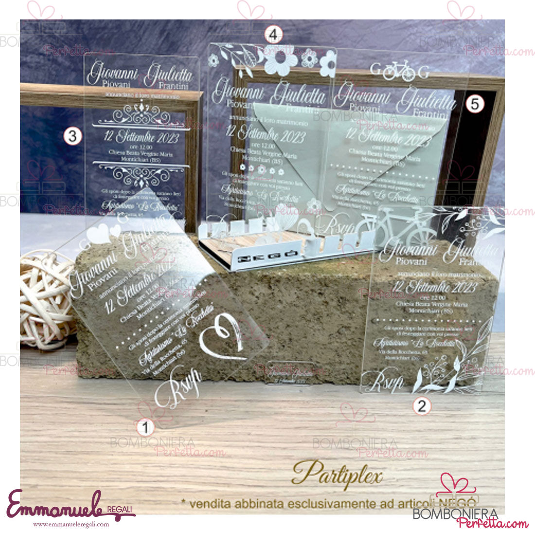 La serie "Partiplex" è una linea di nuove idee di partecipazioni al vostro matrimonio personalizzabili e realizzate in plexi. ll giorno in cui festeggiamo un’occasione speciale è un giorno che vogliamo ricordare per sempre.
