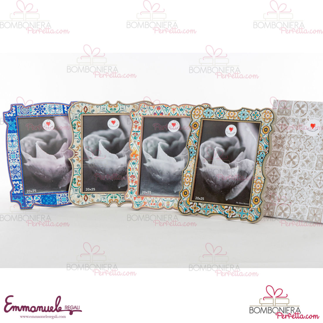 Bomboniera solidale " Porta foto grande in ceramica con 4 decori damascati assortiti " collezione Cuor damasco di Cuorematto, porta foto in ceramica con 4 decori damascati assortiti. Completo di scatola regalo. Dimensioni esterno cm. 28x33, interno cm. 20x25.
