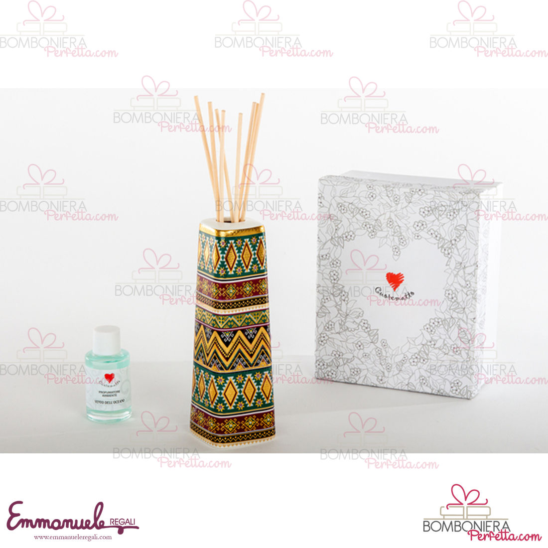 Bomboniera solidale " Profumatore in ceramica con decoro arabeggiante " collezione Cuor d'oriente di Cuorematto, profumatore in ceramica con colori e decoro arabeggianti. Completo di scatola regalo.
