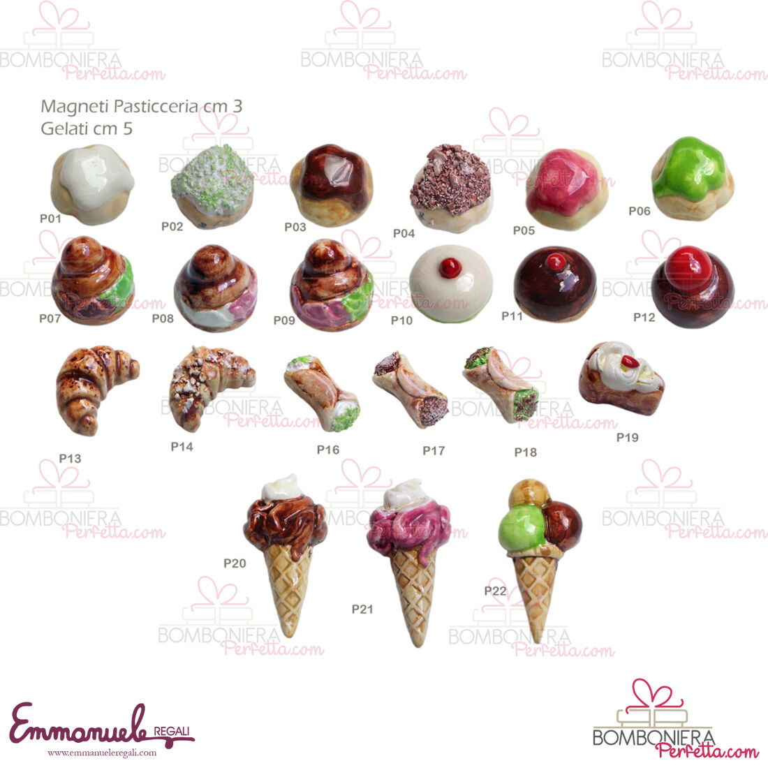 La linea "Magneti Pasticceria" di le ceramiche di Nonna Rosa è una linea di Bomboniere realizzata in Ceramica interamente dipinta a mano. Essendo una ditta artigianale con un costo aggiuntivo è possibile personalizzare con colore, nome del festeggiato/festeggiata, ricorrenza l'oggetto scelto.