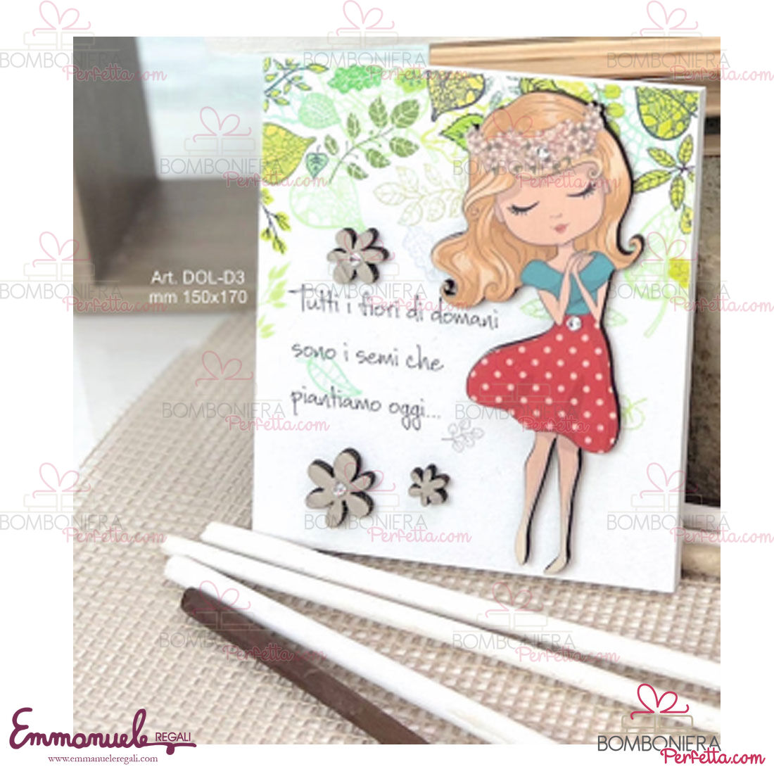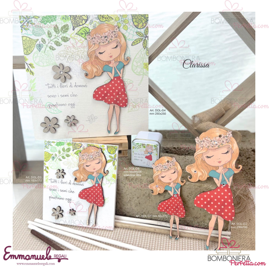 Il quadretto piccolo Clarissa con frase "Tutti i fiori di domani..." della collezione "Dolls" di Negò  è un articolo elegante e originale, perfetto per decorare la vostra casa e per ricordare i vostri eventi importanti.