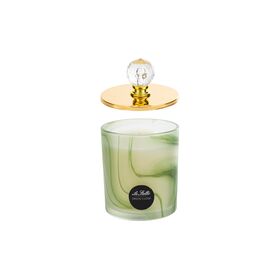 La candela profumata in vetro da 210 grammi, con diametro di 8 cm e altezza di 12,5 cm, presenta un design moderno impreziosito da dettagli dorati e una confezione elegante.
